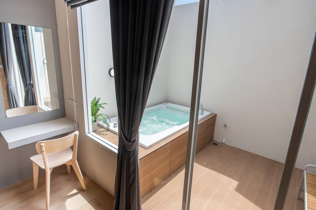 Indulge in the spacious comfort of the Nidhra Villa, your expansive 45 sqm retreat. Unwind on the plush king-size bed and soak in the tranquility of your private balcony, complete with a jacuzzi. This villa is designed for ultimate relaxation, offering all the essentials you need for a memorable stay.